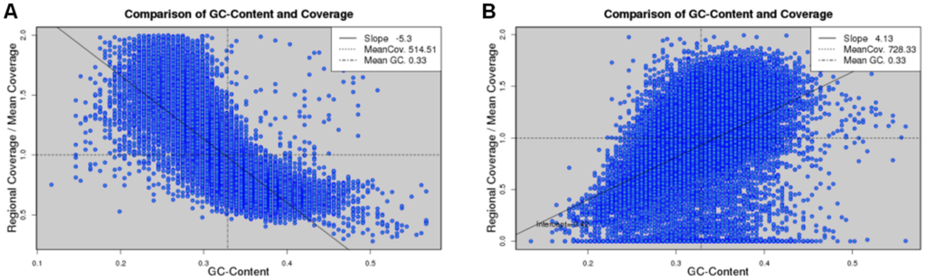 This is a complex topic, where research papers dwell on a computer scientist’s love for sequence windows and normalized read coverage and statistical equations, suffice it to say bias can go in all kinds of directions, and there’s a lot of variability in several dimensions. (See figure – both sequence plots are from the same species of bacteria, just different strains: S. aureus USA300 and S. aureus MRSA252. One has a falling coverage as a function of G-C content, and the other a rising coverage plot (!)