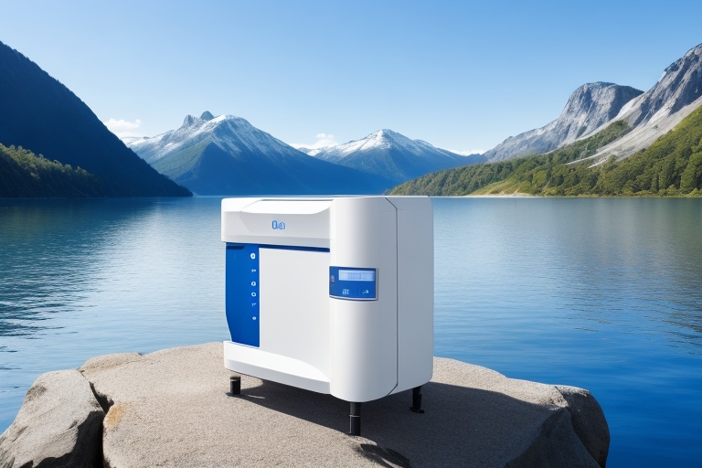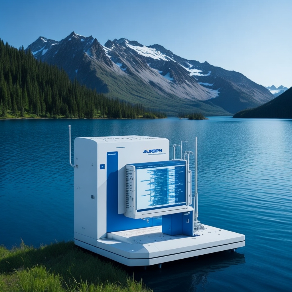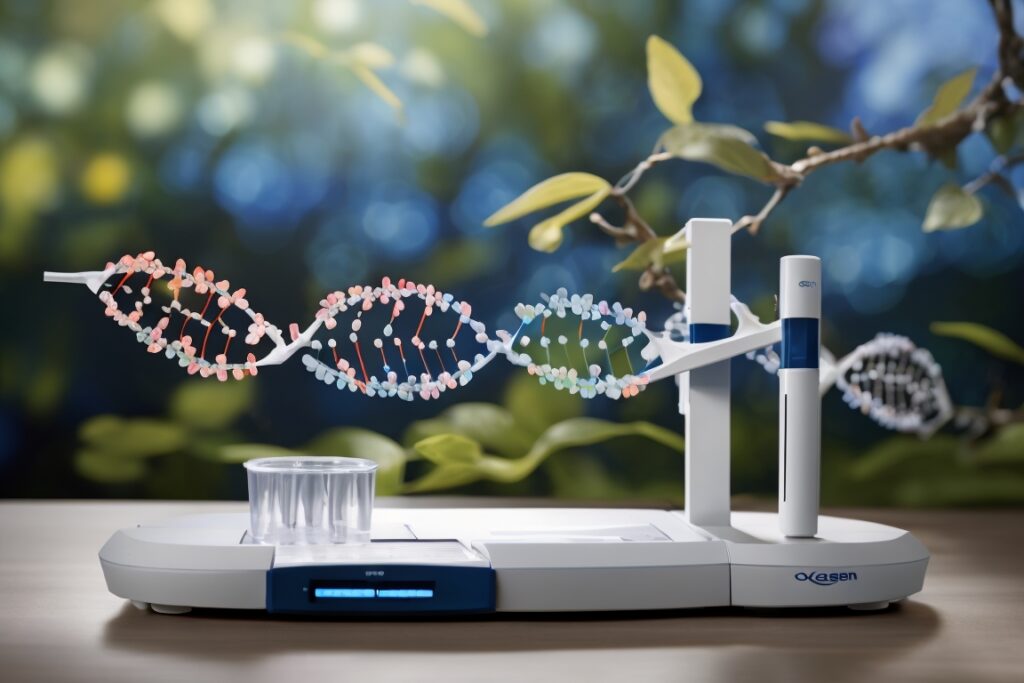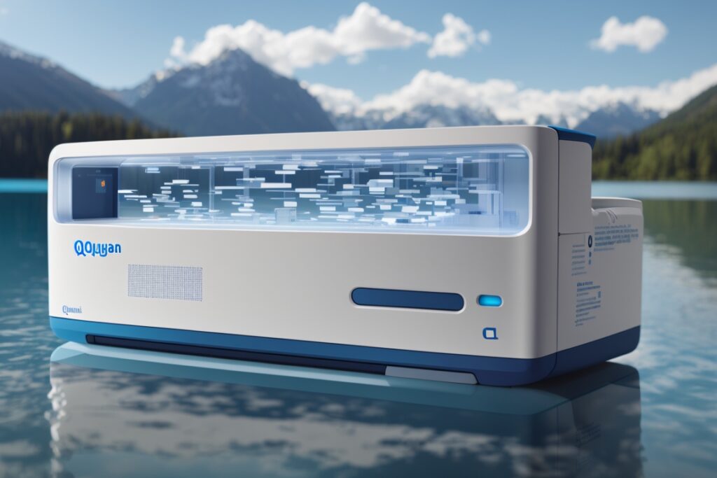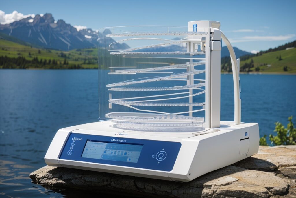 This is an AI interpretation of a prompt “Use an image of a QIAGEN GeneReader next-generation sequencing instrument as the centerpiece, decorate it with DNA helices in a lattice formation like a wreath around its top, and the setting of a deep blue lake with light shimmering on the surface of the water.” The artistic model was SDXL 0.9.