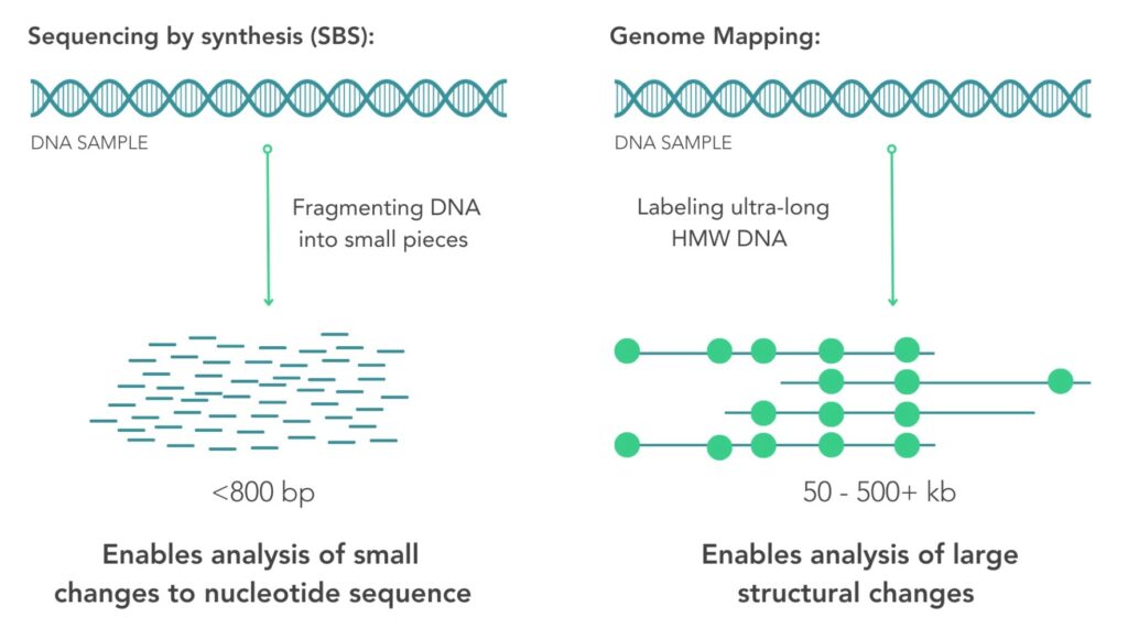 Figure 1 below (kindly provided by Nabsys) compares conventional next-generation Sequencing by Synthesis (SBS) to genome mapping.