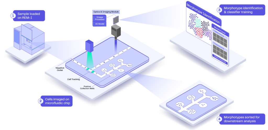 The REM-I instrument takes cells in suspension, and are loaded and analyzed by an automated microfluidic system. The instrument captures high-resolution brightfield images, and can sort cells in six different ways for downstream analysis. (A typical analysis would be single cell RNA-Seq whole transcriptome analysis.) See figure 2 for an illustration of how the instrument works.